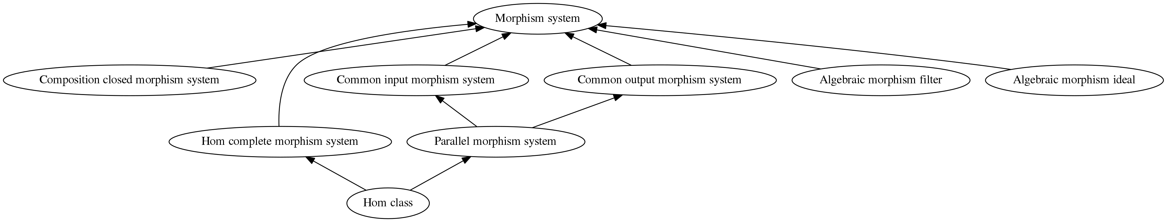 Morphism systems are the basic objects of most of category-theory. Hom classes appear here as the inverse images of the function that maps any morphism to its ordered pair, and they are non-empty for any ordered pair in the morphic preordering. In other words, there is a mapping $f : R \to Hom$ that maps each ordered pair to a non-empty set of morphisms which are generalizations of the edges of the preorder. Other types of morphism systems include common input and common output families of morphisms, of which parallel morphism systems are an intersection. Common output systems are used in the definition of sites, for example. Hom classes are maximal parallel families of morphisms.While we demonstrated how objects in a category are naturally preordered, it is not hard to see how the morphisms in a category are preordered as well. Algebraic preorders, introduced naturally in monoid, can equally be applied to categories to get a preordering of morphisms based upon reachability. In the case of single-object categories this of course naturally coincides with the monoid definition. Algebraic lower sets, upper sets, and principal ideals and filters in categories naturally arise as classes of morphism systems from the preordering on morphisms.